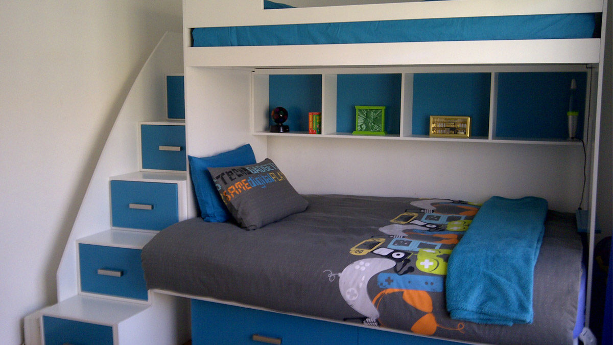 این تخت خواب با داشتن کشوهای زیاد در کنار تخت و پله های آن، فضای کافی را برای لوازم کودکان فراهم می کند. این مدل برای اتاق های کوچکی که کمد دیگری ندارد بسیار خوب هستند. حتی می توان کشوهای کناری را نیز به کمد تبدیل کرد.